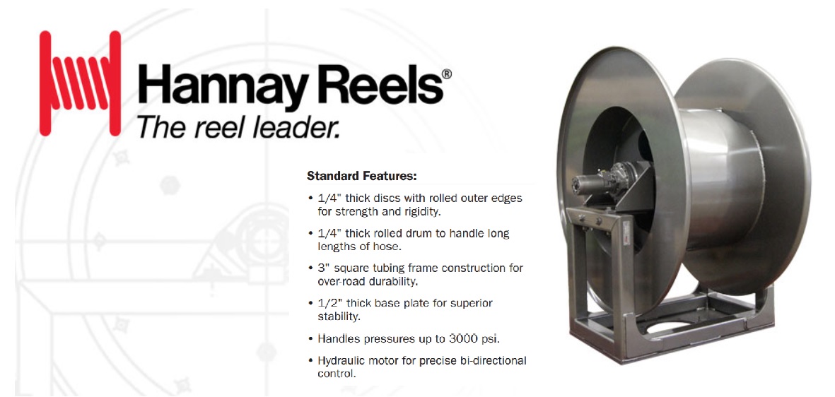 Standard features include thick discs and base plate for strength and rigidity, rolled drum to handle long lengths of hose and 3" square tubing frame construction for over-road durability.